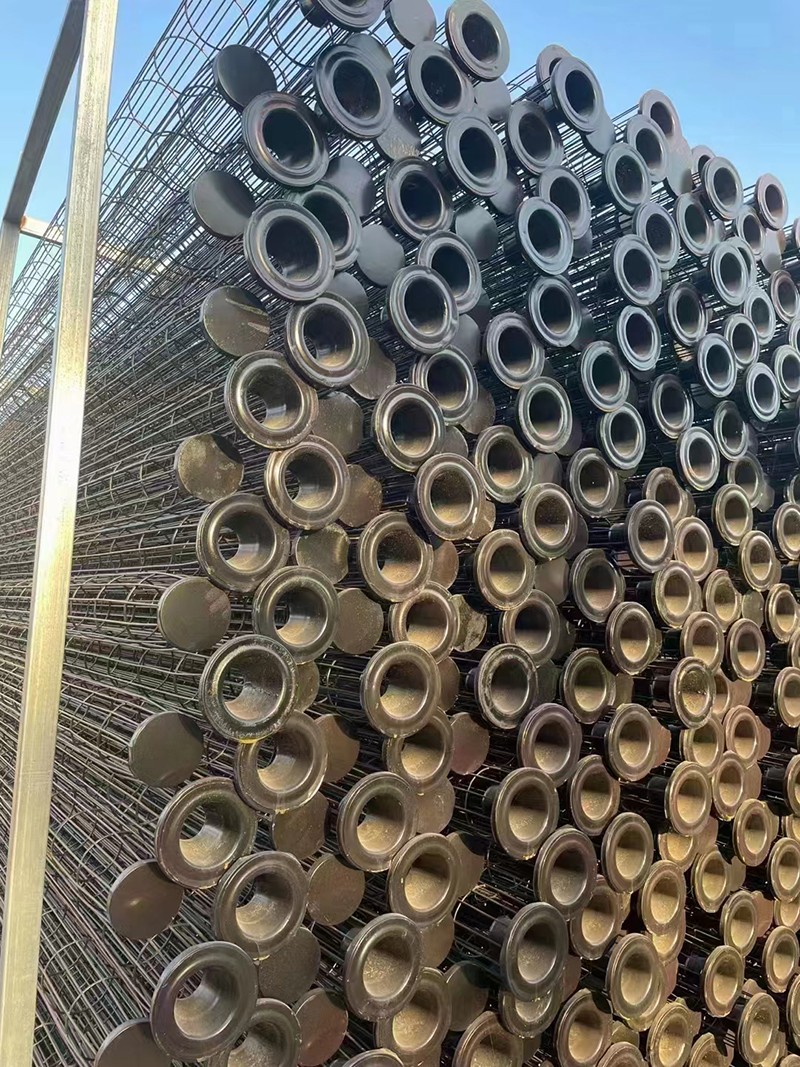 除塵布袋骨架是采用直徑為3-4個的碳鋼絲或不銹鋼絲為原材料,由縱筋和支撐環(huán)縱橫疊交焊接成的籠形件。除塵布袋骨架安裝在脈沖除塵器和氣箱式脈沖除塵器中的花板孔上,用來支撐除塵濾袋防止塌陷,有助于粉塵的清除和提供除塵效率。粉塵是附著在除塵濾袋的外表面,含塵氣體經(jīng)過除塵器時,粉塵被捕集在濾袋的外表面,而干凈氣體通過濾料進入濾袋內(nèi)部后經(jīng)風機排出。